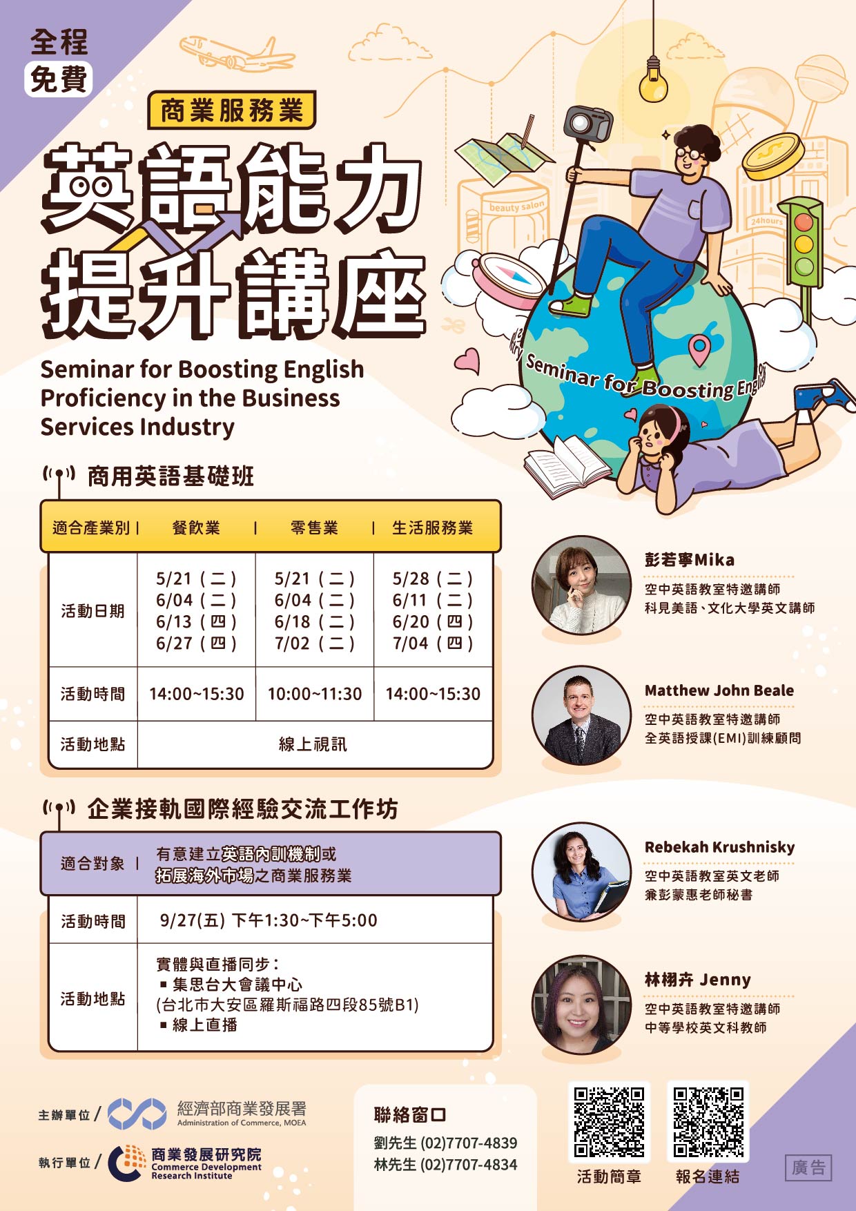 首頁 訊息公告活動訊息【公告】2024商業服務業英語能力提升講座-活動開放報名囉! (活動已截止) 回上一頁 友善列印 字級: 小字級 中字級 大字級 若您無法使用字級縮放功能,請改用鍵盤 "Ctrl" + "加號鍵" 或 "Ctrl" + "減號鍵",來放大或縮小字級。 分享: 分享到我的Facebook 分享到我的Twitter 分享到LINE 當SCRIPT關閉時,請點選以下連結. Facebook twitter Line 活動訊息 【公告】2024商業服務業英語能力提升講座-活動開放報名囉! (活動已截止) 2024-04-30 報名連結:https://reurl.cc/VzpqRY 活動簡章 商業服務業英語能力提升講座_活動簡章.pdf檔案下載
