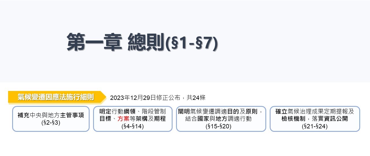 - 闡明氣候變遷調適目的及原則,結合國家與地方調適行動(§15-§20)