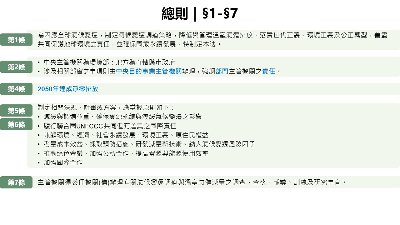 - 第1條 為因應全球氣候變遷,制定氣候變遷調適策略,降低與管理溫室氣體排放,落實世代正義、環境正義及公正轉型,善盡共同保護地球環境之責任,並確保國家永續發展,特制定本法。