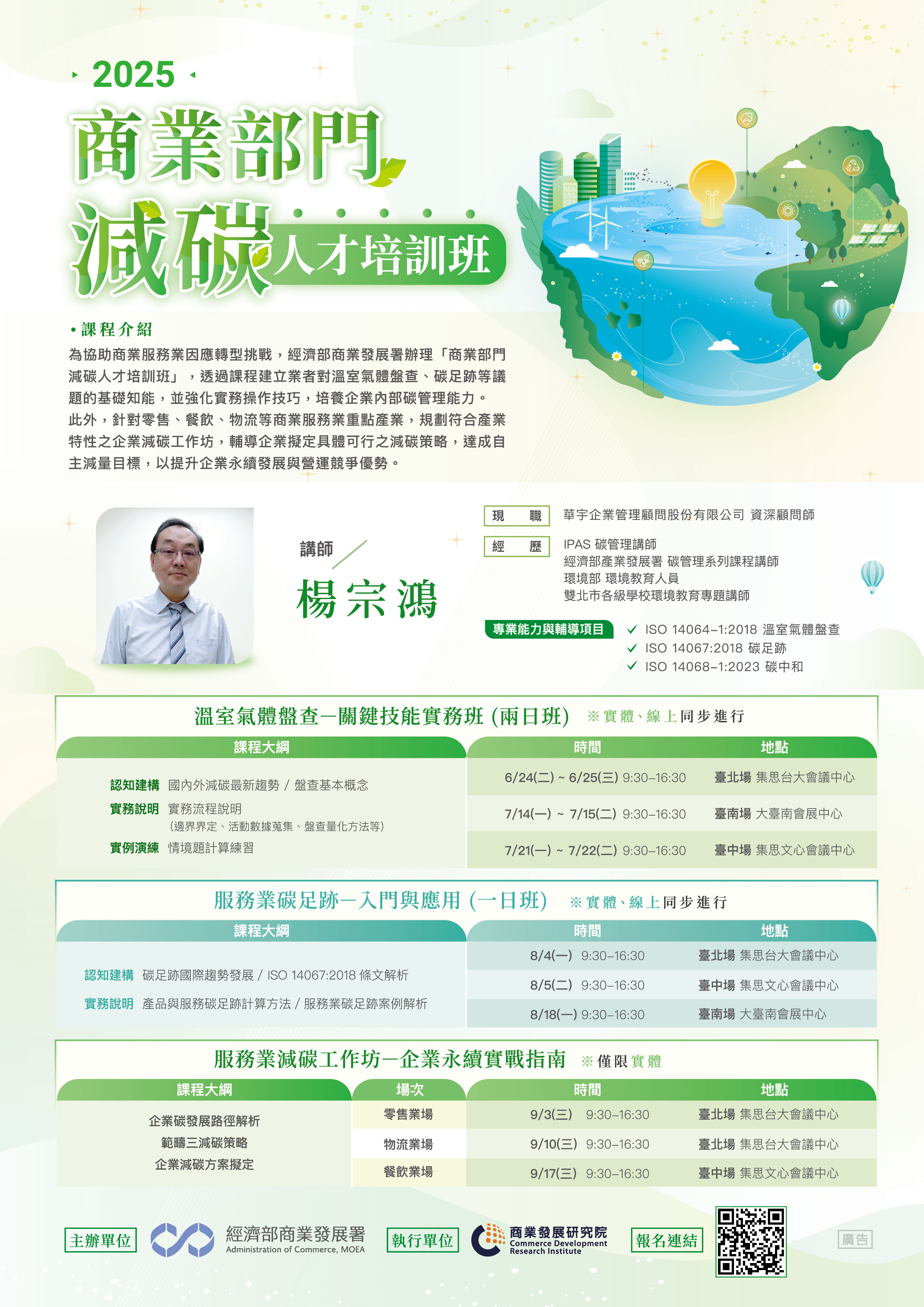 在2050淨零排放目標下,我國逐步推動與完善產業減碳轉型等相關規範,環境部已公告第三波擴大溫室氣體盤查登錄對象,將部分用電量高或門市據點數量多之服務業者納入管理,本署訂於本(114)年6月到9月辦理9場次溫室氣體盤查、碳足跡等實務操作課程,並針對零售、餐飲、物流等商業服務業重點產業,依產業特性辦理企業減碳工作坊,協助企業達成減量目標提升永續發展與營運競爭優勢!