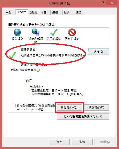 2.如已成功加入「信任的網站」時,於點選「安全性」後,應該可以看到「信任的網站」文字呈現反白(表已加入信任的網站,如沒有請重新執行加入信任的網站動作),請點選下方「自訂等級」按鈕。 |