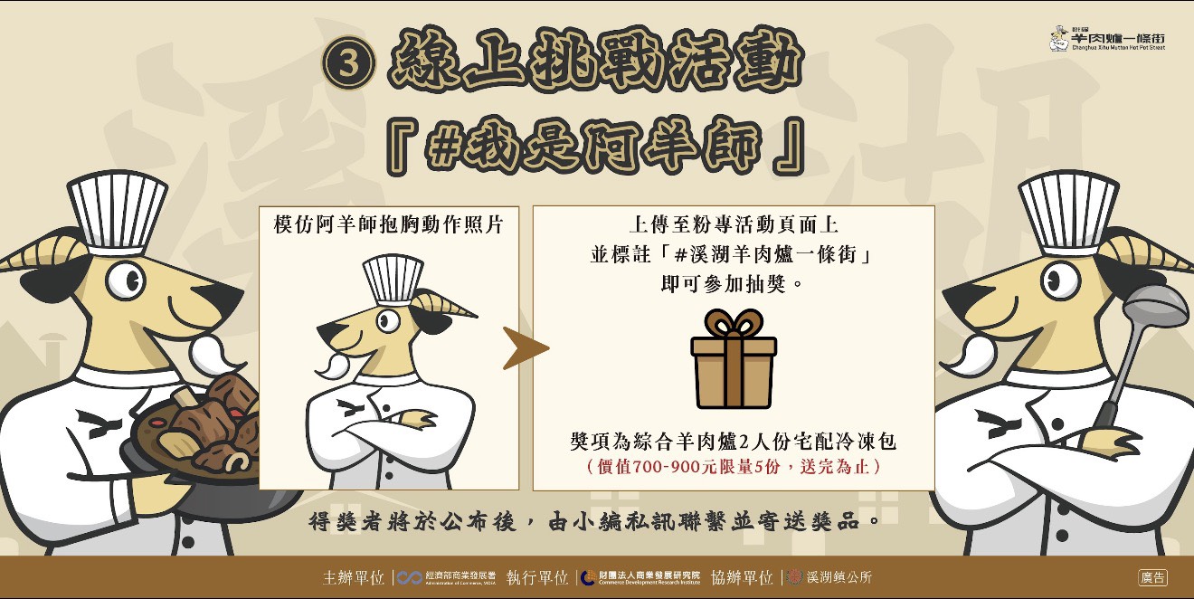 • 上傳「模仿阿羊師抱胸動作照片」並標註「#溪湖羊肉爐一條街」即可參加抽獎。