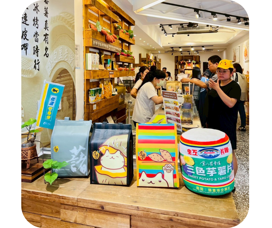 商家們製作販售的地瓜片與零食,酥脆爽口,咬下去喀喀作響,總讓人不自覺一片接一片,停不下來。而更吸引目光的,是一間間以地瓜為核心創意的店鋪,如地瓜冰淇淋、聯名地瓜片、各式手工甜點等,這些混合傳統與創新的作品,藏著年輕人對在食材的詮釋,也讓地瓜從庶民主食,轉化為具美學與文化價值的記憶媒介。