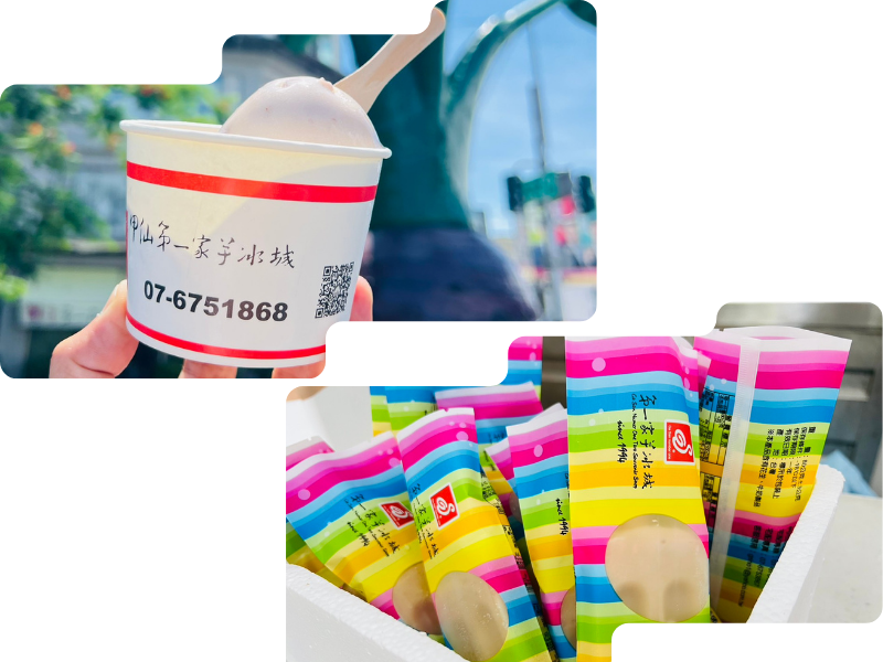 而在甲仙和安老街,另一段冰品傳奇也同步萌芽。早在日治時期的昭和年間,劉瑞源先生便於當地經營「瑞和商號」,傳授製冰技藝給兒子劉建芳與媳婦莊麗紅。當時剉冰仍是主流,為求與眾不同,兩人走遍南台灣尋訪各式冰品靈感。最終,他們回到家鄉,以尚未廣為應用的甲仙檳榔心芋為原料,開發出「芋仔冰」,這項創新冰品於1974年問世,命名為「小奇芋仔冰」,也成為甲仙地方冰品文化的另一座地標。