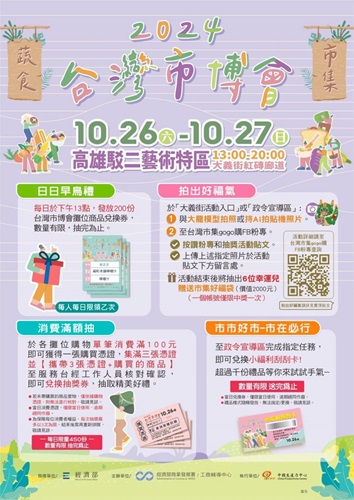2024台灣市博會-南區場 最終場週末登場 聽說這是隻龍 最後出沒的時間! 就在2024台灣市博會-南區場 本次限定主題專區-傳市好味-蔬食市集 愛吃菜的朋友千萬不要錯過唷! 喜歡呷肉肉、呷甜甜、手作藝品的朋友也不要失望 現場也有經濟嚴選-台灣傳市展區 多元美食、特色手工藝品,任君挑選 趕快來高雄駁二藝術特區(大義紅磚廊道)一起抓龍 吃美食吧! 現在還有推出南區場限定好禮 千萬不要錯過囉!! 活動資訊 活動日期:10/26(六)-10/27(日) 活動時間:13:00-20:00 活動地點:高雄駁二藝術特區(大義紅磚廊道)