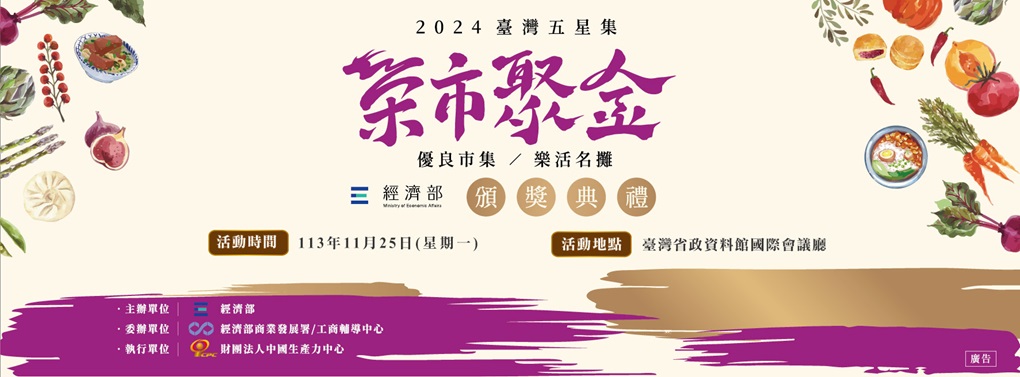 《榮市聚金-2024臺灣五星集》 113年度「臺灣五星集~優良市集暨樂活名攤」摘星名單出爐 恭喜獲獎的市集和攤商 https://reurl.cc/zDvmKN 另經濟部優良市集暨樂活名攤頒獎典禮即將隆重登場! 活動時間:11/25(一) 下午2:00 活動地點:南投中興新村「臺灣省政資料館」(南投市中正路2號)