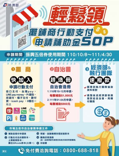 隨著疫情逐漸趨緩,政府推出振興五倍券,為協助在地小攤商爭取這一波商機,經濟部中部辦公室針對傳統市場及夜市使用行動支付的攤商補助每攤1,800元,另外也對於市集自治會和管委會給予2,000~10,000元不等的補助,鼓勵推廣行動支付,目前已經開放受理申請。 傳統市場民眾習慣現金交易,但濕濕髒髒的紙鈔容易潛藏細菌病毒,因應COVID-19疫情許多消費者已經逐漸減少現金交易降低接觸風險,加上這次振興五倍券推廣使用數位支付,傳統市場順勢導入行動支付交易,正是適當時機。 經濟部中部辦公室郭坤明主任表示,防疫期間大家已經習慣實聯制掃碼動作,藉此推廣在市場、夜市使用掃碼行動支付,希望轉換交易的習慣,讓接觸性染疫風險降低。考量今年五至七月間的疫情影響,嚴重衝擊攤商的生計,而一般小攤商對行動支付可能增加的成本頗有疑慮,於是,經濟部特別規劃補助方案,只要攤商加入可配合振興五倍券平台上的行動支付,在本(110)年12月底前透過自治會或管委會造冊請領者,即撥給每攤1,800元補助金(明年1月以後補助每攤900元);自治會或管委會則另有協助推廣補助金2,000元至10,000元。這些補助方案已經上路,許多市場和夜市也陸續申請中,請符合資格的市集及攤商儘速提出申請!