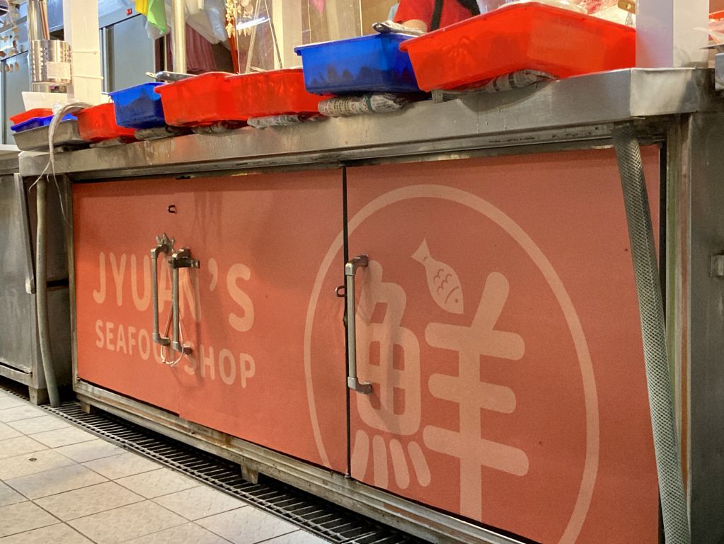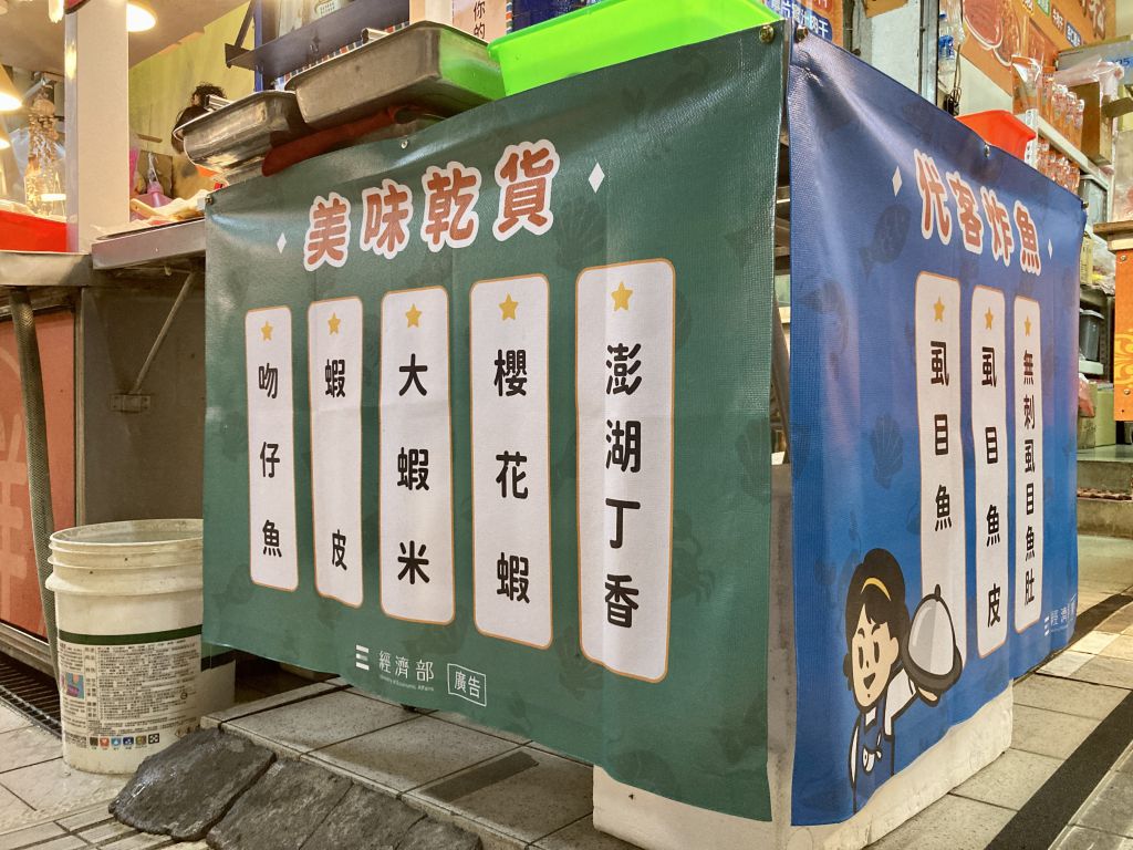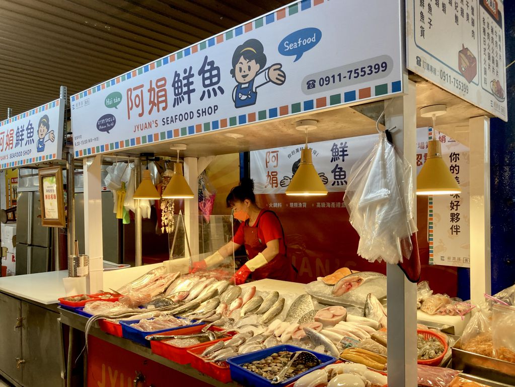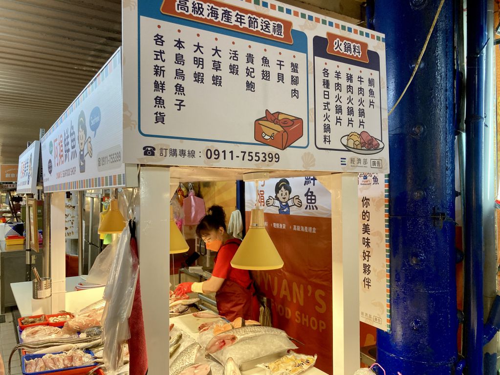 3.櫃位帆布全數更換:運用品牌設計,將背面原本與縣長照片的形象牆改成阿娟鮮魚的品牌形象牆,側面桌子帆布也重新設計更換。