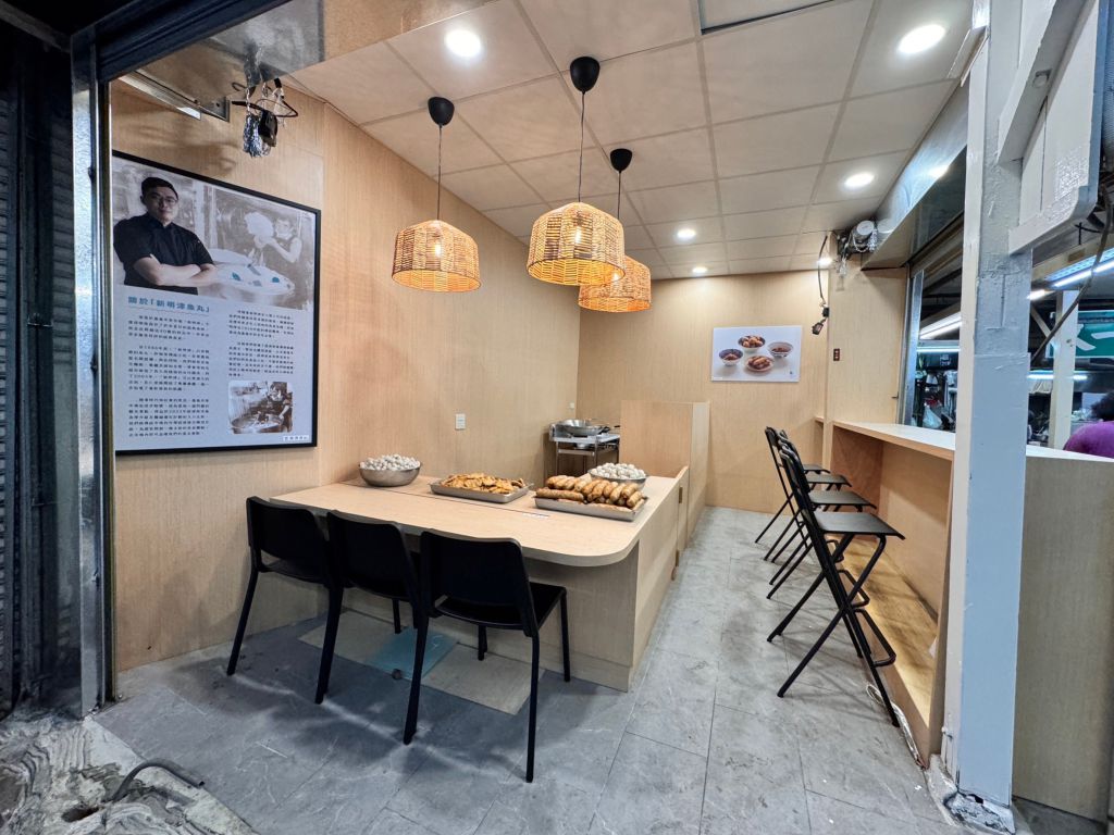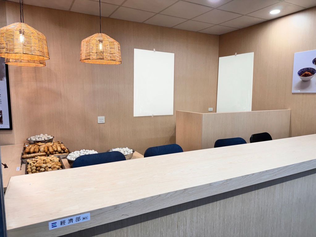 2.牆面及櫃檯座位區以平釘木作封夾板,選用木板原色上啞光漆,保留木質調,並於爐台旁設置隔悶熱玻璃,以防木板變質。