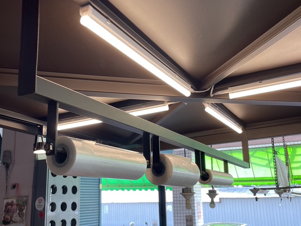 - 層架上方設置一排軌道燈。