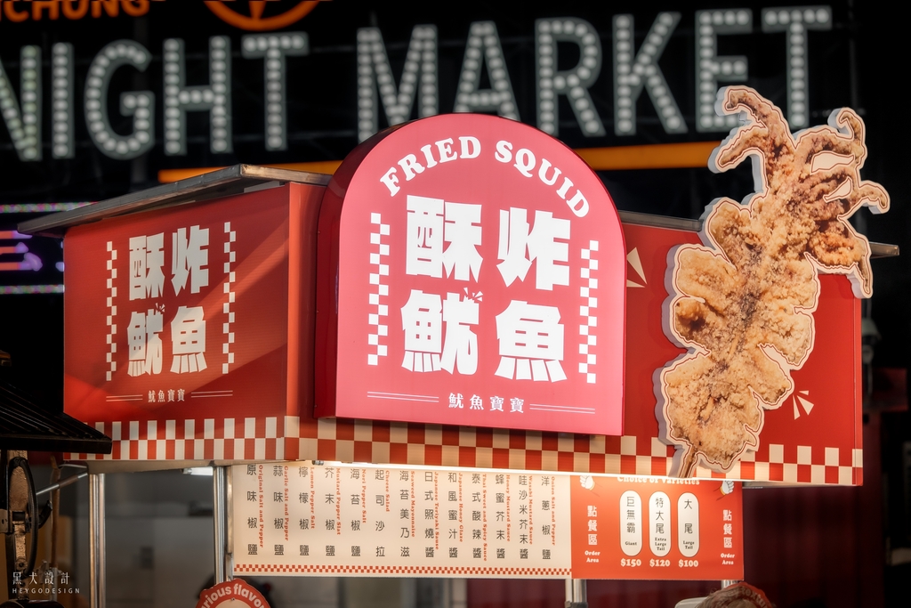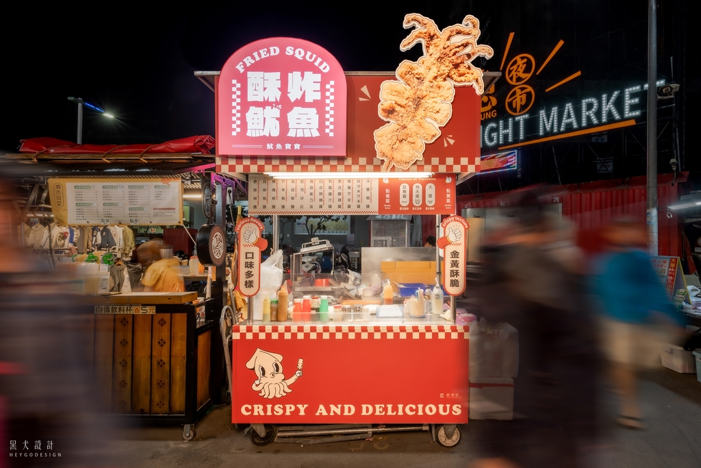 攤位加入可愛的魷魚寶寶角色,以及充滿張力的大型招牌, 強調「酥炸魷魚」 4字, 搭配相當鮮明的紅色 ,能成為該轉角位置指標拍照攝影攤位 。
